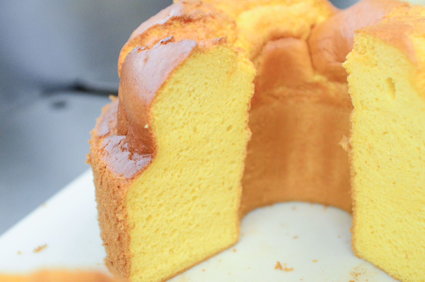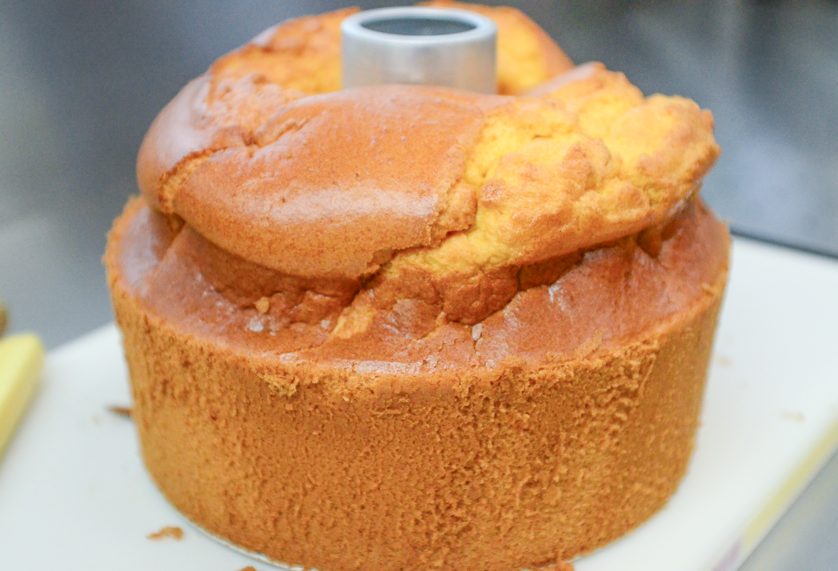 型から出してみて…中がどんな状態かドキドキです。(シフォンケーキはカットして中身を見るまでわかりません。)