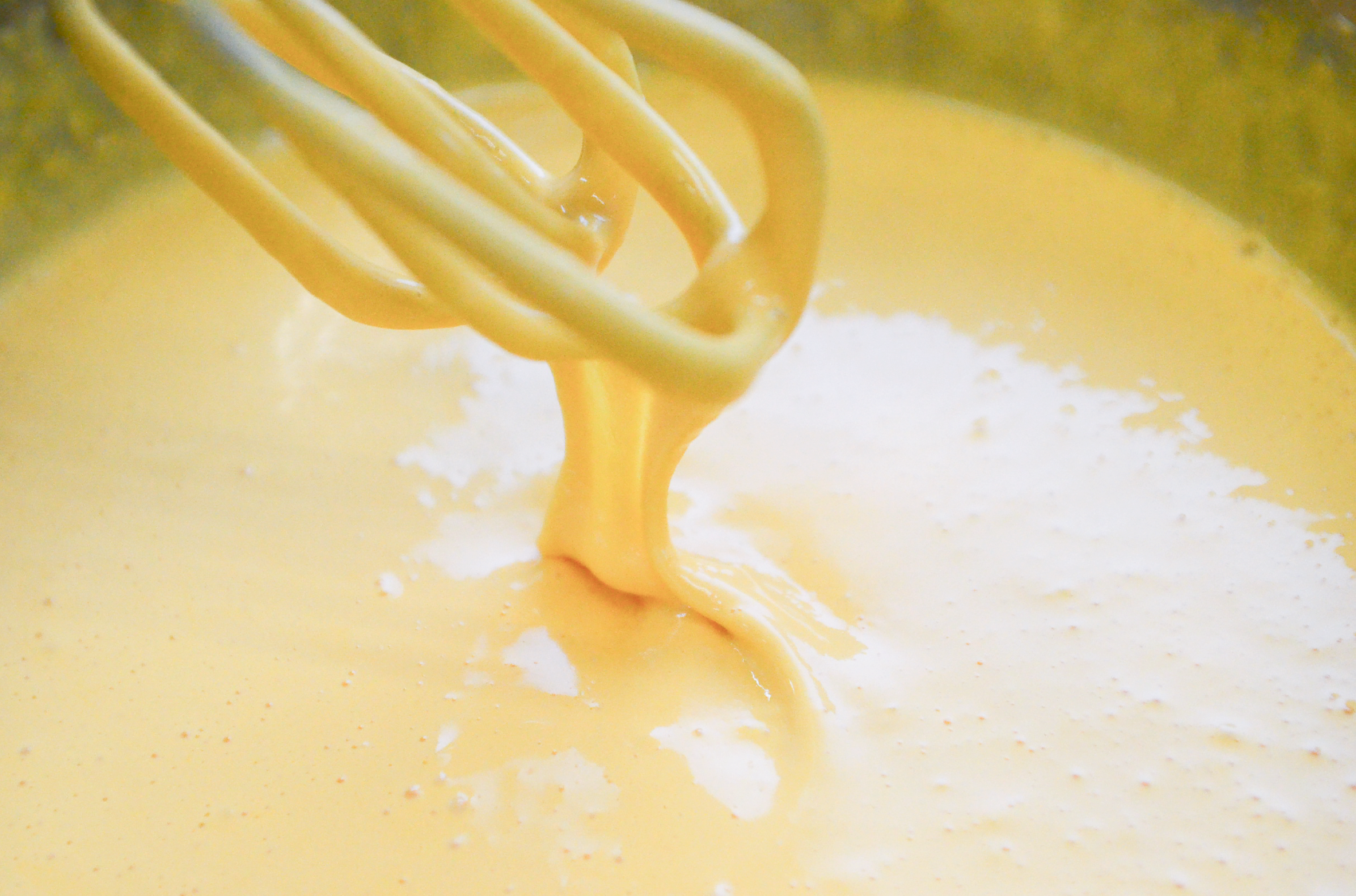 リボーヌ状になるまで根気よく生地をまぜていきます。