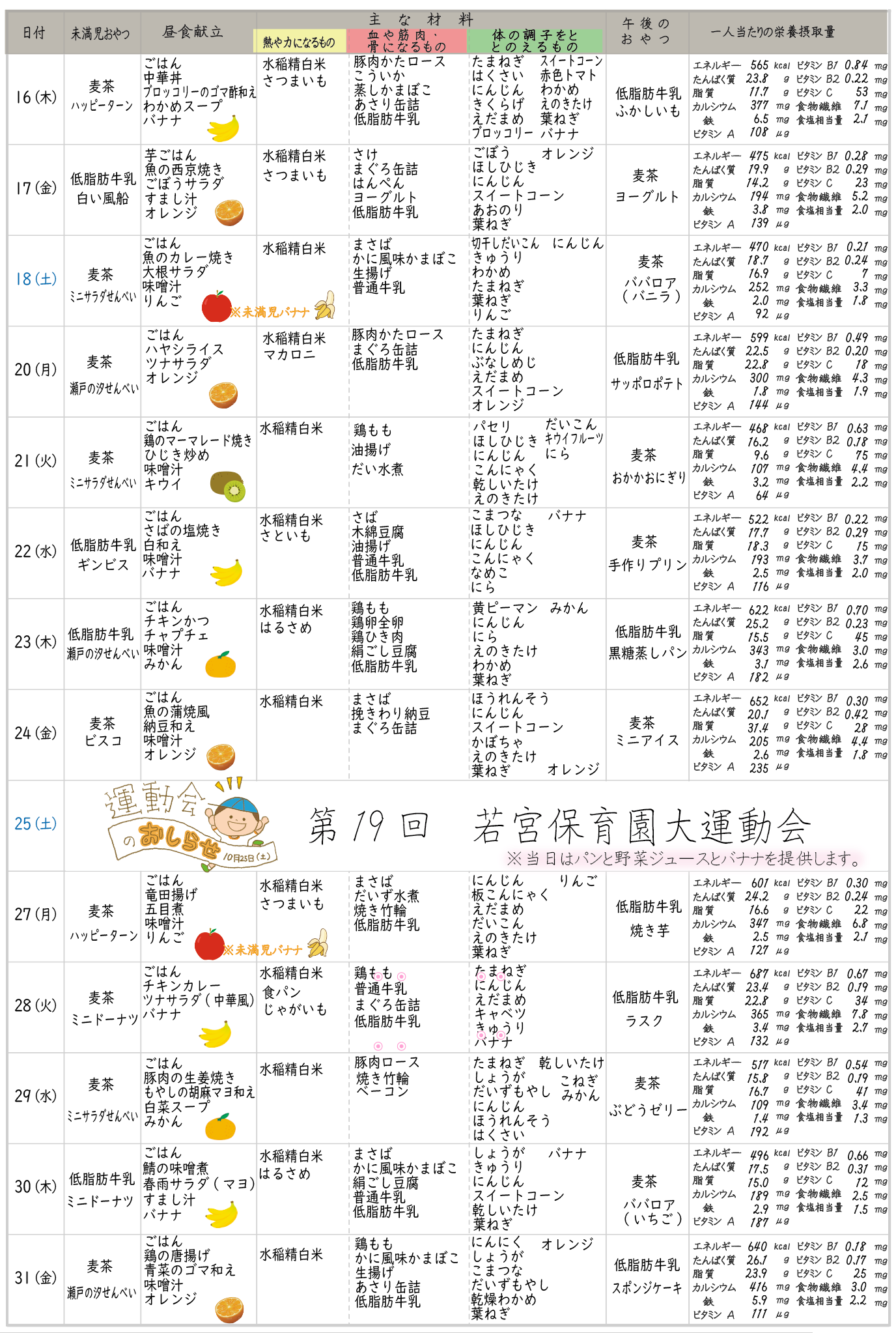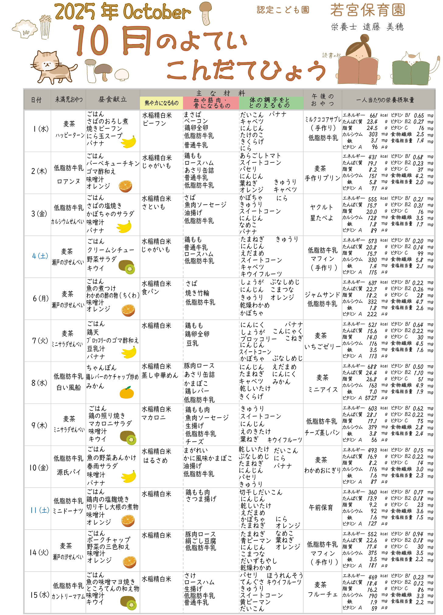 今月の予定献立表です。 2021/9/5 2025/10/4 🍁 2025年10月の予定献立表 🍎 仕入れの状況などにより献立を変更する場合がございます。予めご了承ください。 ※献立は栄養士(遠藤 美穂)先生が立案しています。 2025年10月の献立表(前半)※タップで拡大 2025年10月の献立表(後半)※タップで拡大
