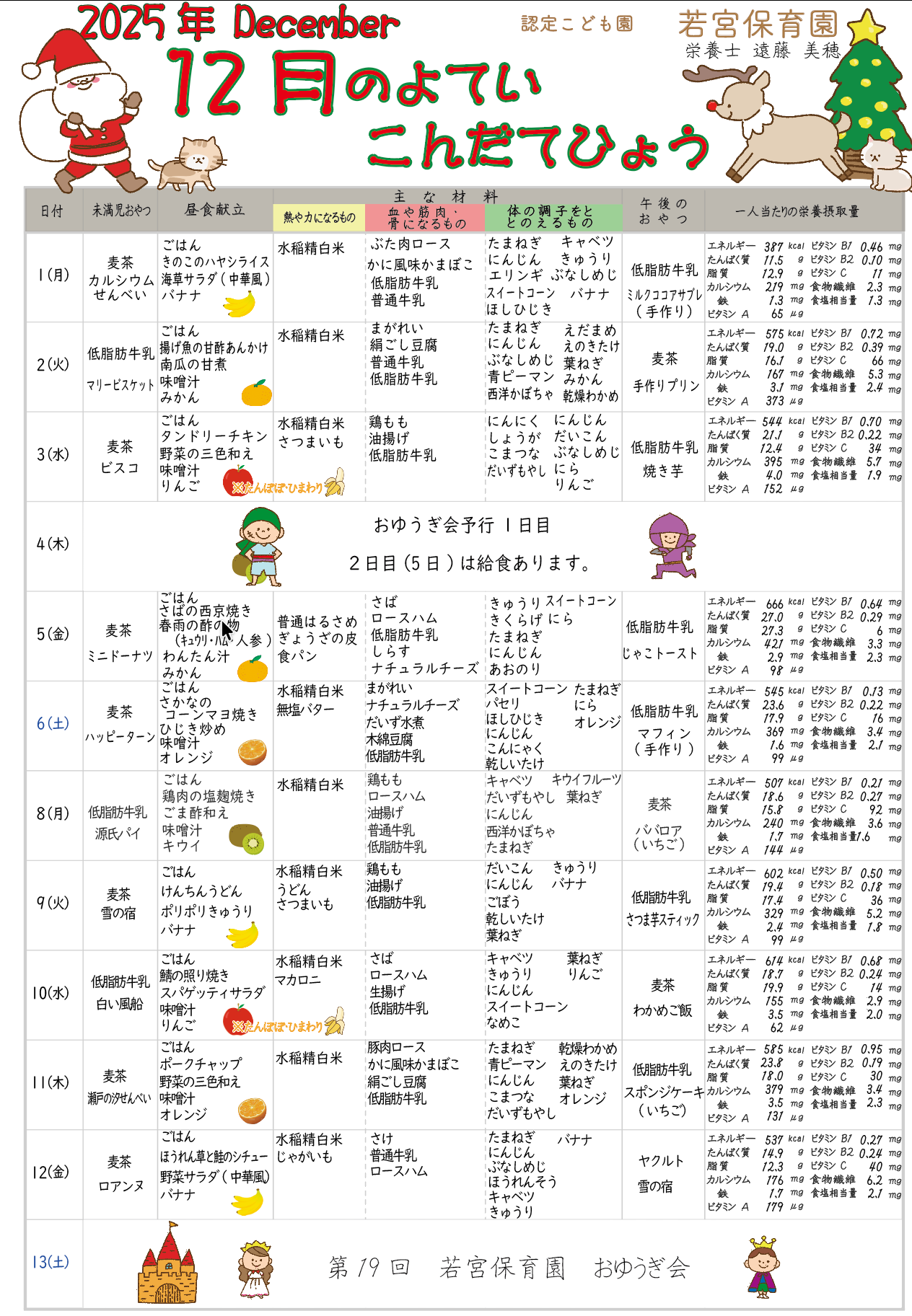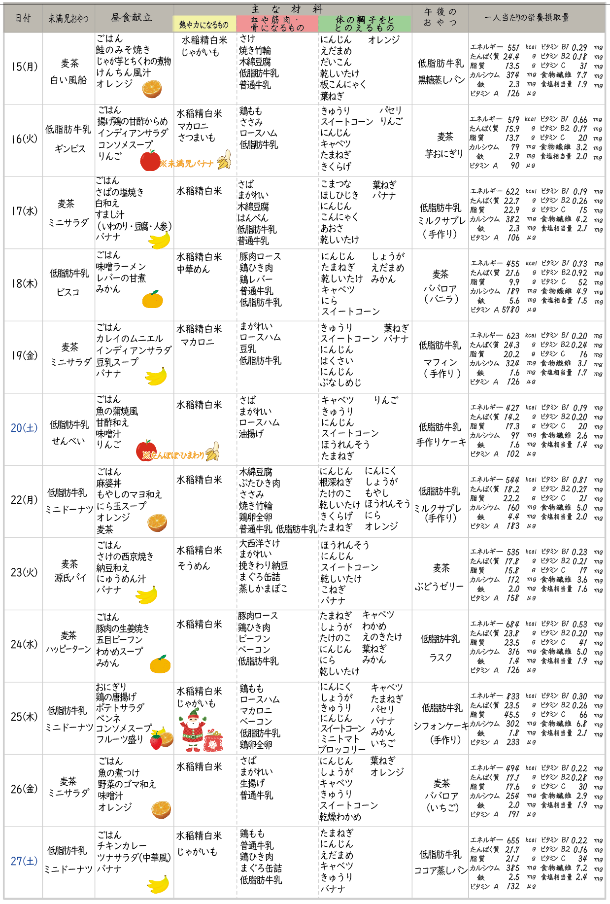 今月の予定献立表です。 2021/9/5 2025/12/17 2025年12月の予定献立表 仕入れの状況などにより献立を変更する場合がございます。予めご了承ください。 ※献立は栄養士(遠藤 美穂)先生が立案しています。 2025年12月の献立表(前半)※タップで拡大 2025年12月の献立表(後半)※タップで拡大